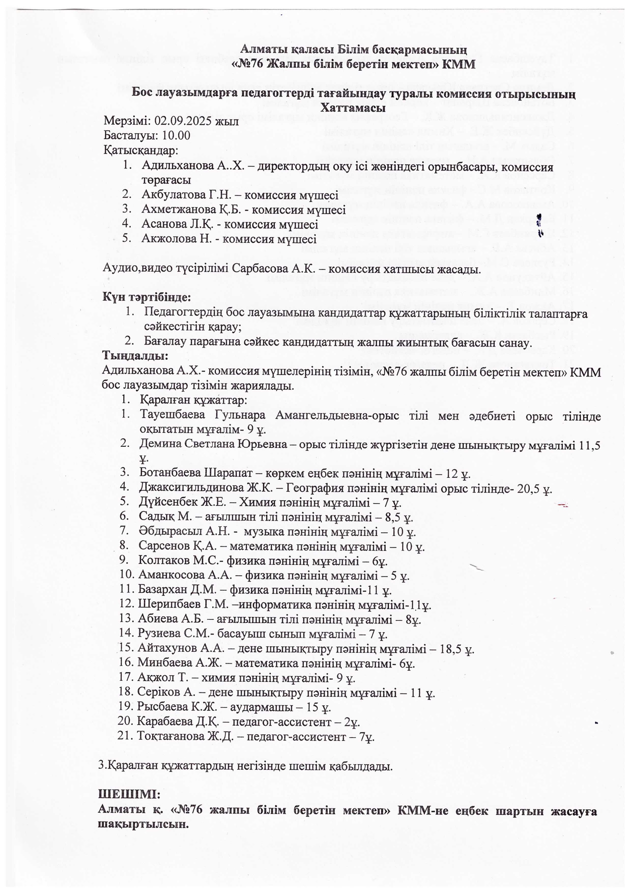 02 сентябрь 2025 0 1 2 3 4 5 Бос лауазымдарға педагогтерді тағайындау туралы комиссия отырысының хаттамасы