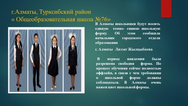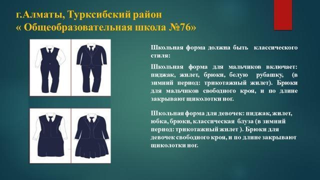 пиджак, жилет, юбка, брюки, классическая блуза (в зимний период: трикотажный жилет ). Брюки для девочек свободного кроя, и по длине закрывают щиколотки ног.