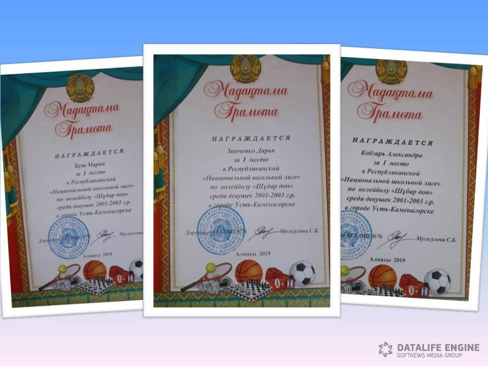 10 апрель 2019 0 1 2 3 4 5 Біздің марапаттарымыз Ерланова Аружан Кобзарь Александра Стребкова Валерия Зинченко Дарья Анцупова Анастасия Буш Мария І место в Республиканской "Национальный школьной лиге" по волейболу "Шұбар доп" среди девушек 2001-2003 г.р. в городе Усть-Каменагорске