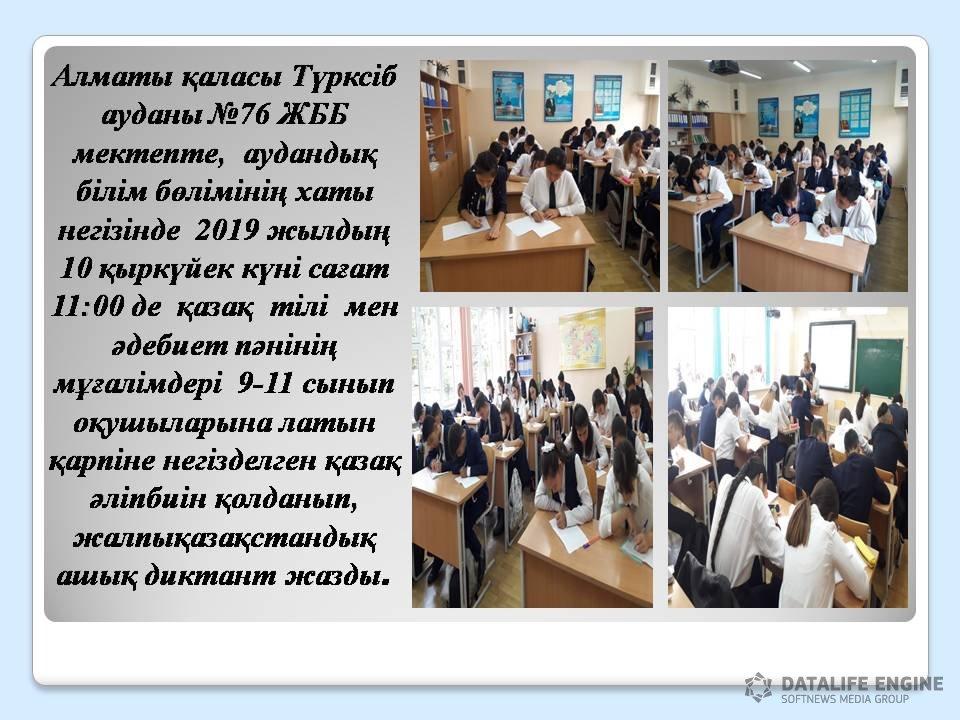 Алматы қаласы Түрксіб ауданы №76 ЖББ мектепте, аудандық білім бөлімінің хаты негізінде 2019 жылдың 10 қыркүйек күні сағат 11:00 де қазақ тілі мен әдебиет пәнінің мұғалімдері 9-11 сынып оқушыларына латын қарпіне негізделген қазақ әліпбиін қолданып, жалпықазақстандық ашық диктант жазды.