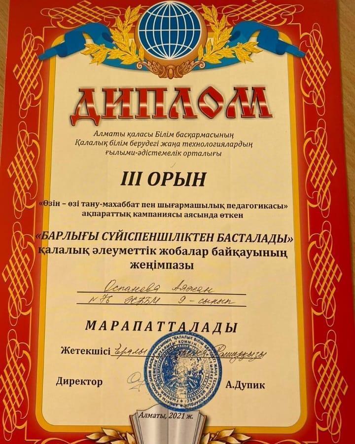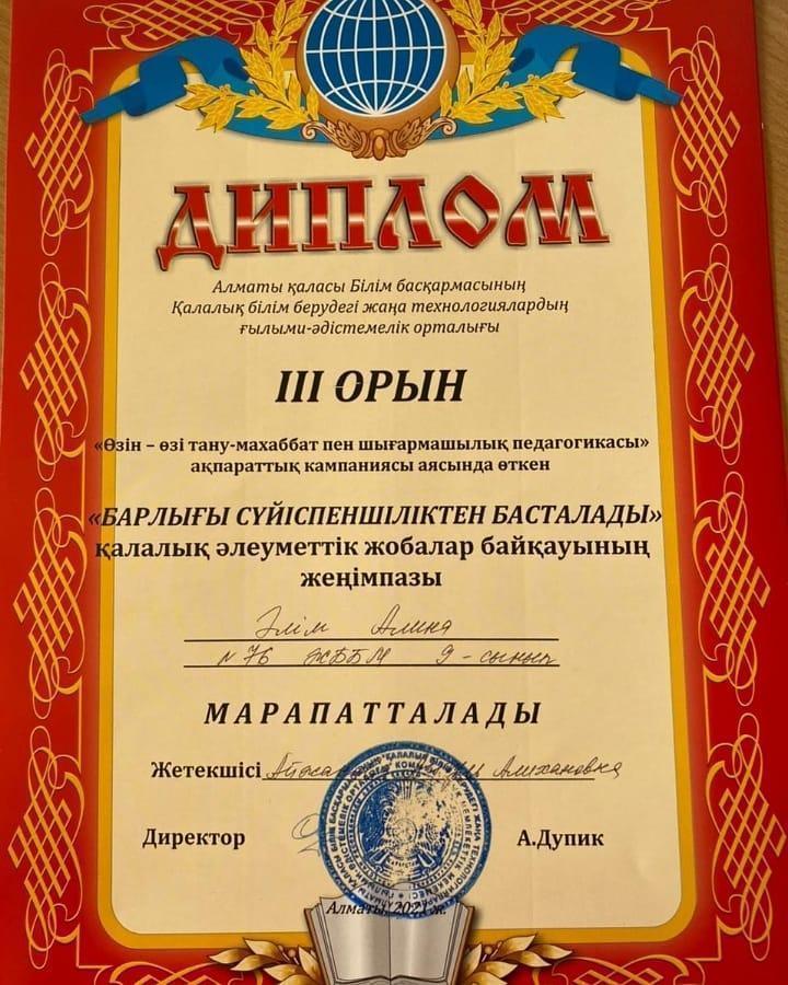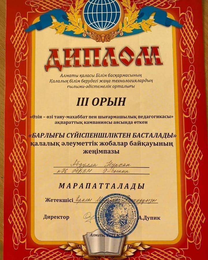 тақырыбында әлеуметтік бейнероликтер жобасы ұйымдастырылды. Қалалық әлеуметтік жобаға қатысып жеңімпаз атанған 9 - сынып оқушылары Әлім Алина, Оспанова Аяжан, Абдулла Нұрхан ІІІ - ДӘРЕЖЕЛІ ДИПЛОМДАРМЕН марапатталды 👋👋👋ҚҰТТЫҚТАЙМЫЗ!