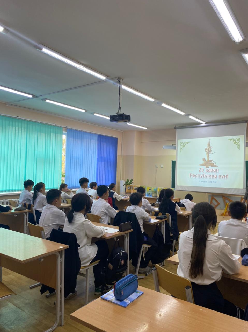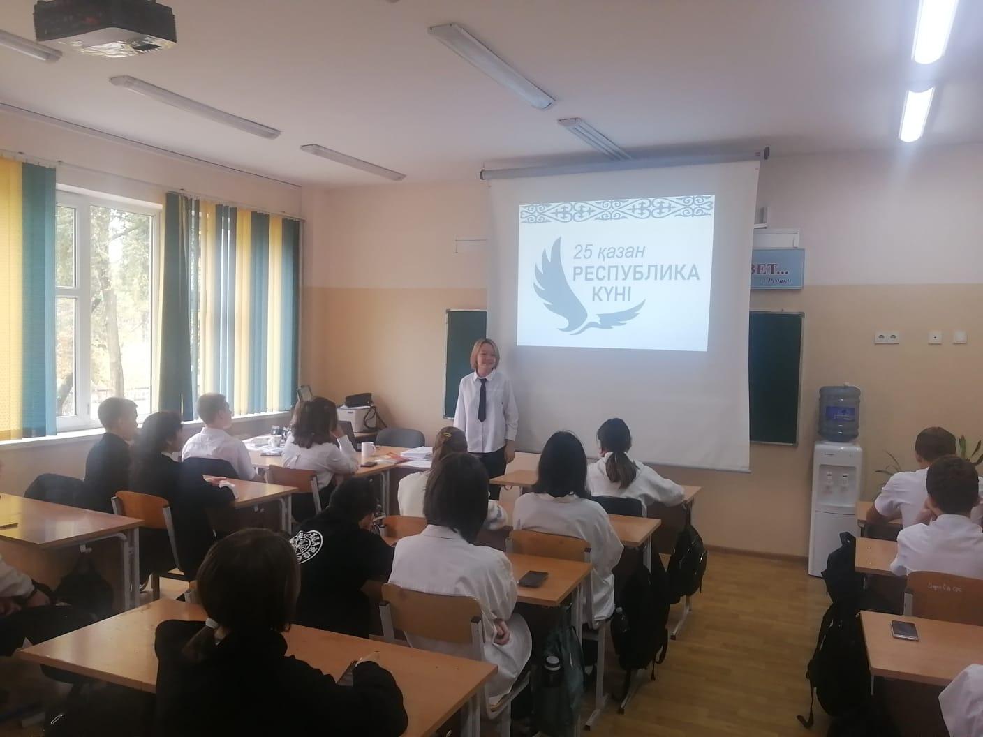 25 қазан Республика күнін мерекелеу қарсаңында Алматы қаласы Білім басқсармасының жоспарына сәйкес мектепте жоспар құрылып, жоспар негізінде 18 қазан күні «Люблю тебя, Мой Казахстан!» , «Мен сені сүйемін, Қазақстаным!» тақырыбында сынып сағаттары өтті.