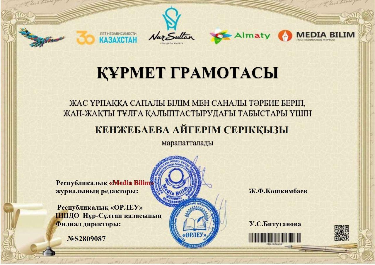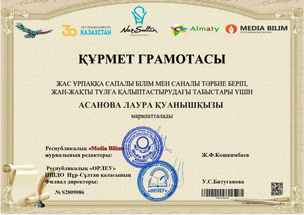Республикалық "ӨРЛЕУ" ПШДО Нұр-Сұлтан қаласының, Жас ұрпаққа сапалы білім мен саналы тәрбие беріп, жан-жақты тұлға қалыптастырудағы табыстары үшін құрмет грамотасымен Филиал директоры мектебіміздің мұғалімдері марапатталды.