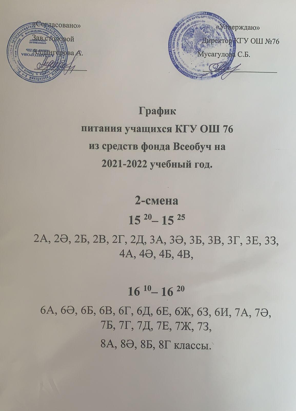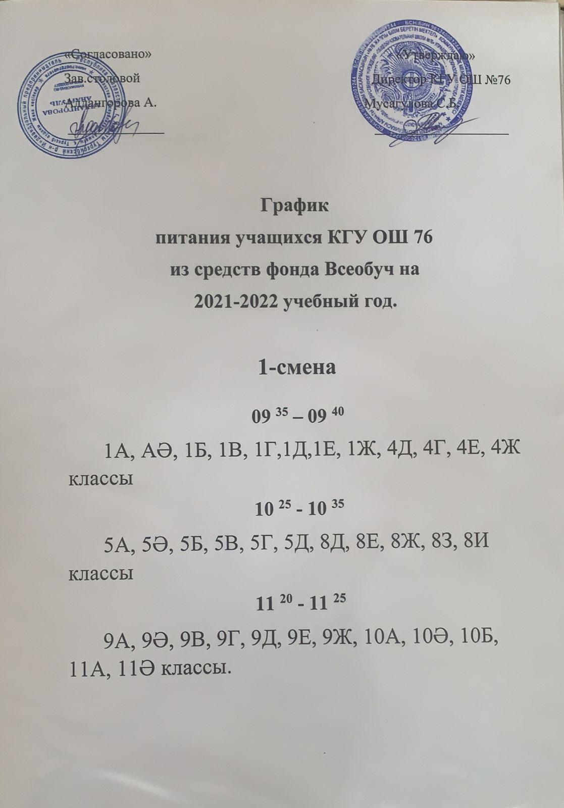 01 сентябрь 2021 0 1 2 3 4 5 2021-2022 оқу жылына арналған Жалпыға бірдей оқу қорының қаражатынан №76 ЖББМ КММ оқушыларының тамақтану кестесі, График питания учащихся КГУ ОШ №76 из средств фонда Всеобуч на 2021-2022 учебный год