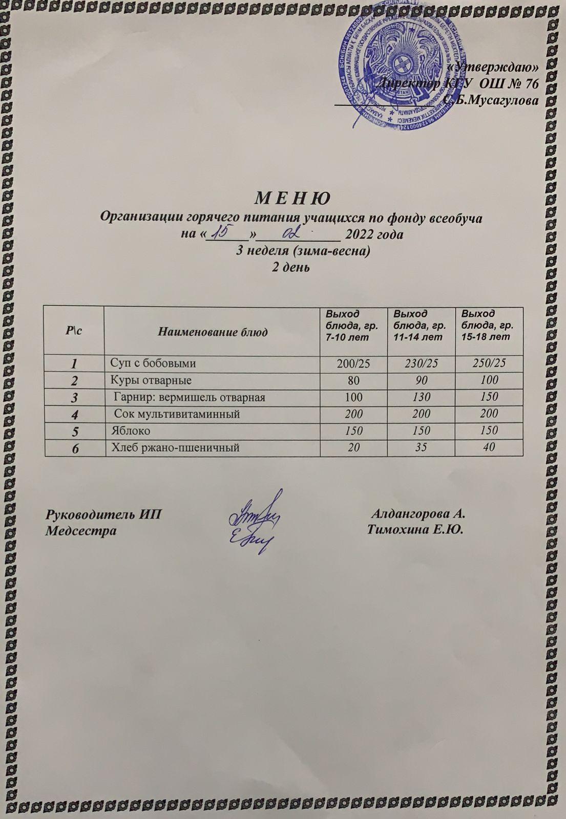 15 февраль 2022 0 1 2 3 4 5 Жалпы білім беру бойынша күнделікті ыстық тамақ мәзірі 3 апта (қыс-көктем) 2-ші күн, Ежедневное меню горячего питания по всеобучу 3 неделя (зима-весна) 2 день