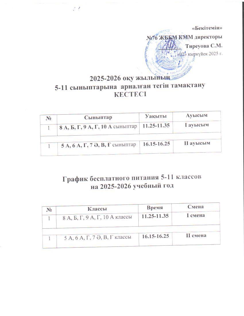 02 сентябрь 2025 0 1 2 3 4 5 2025-2026 оқу жылына жалпы оқумен қамту қорынан №76 ЖББМ оқушыларының тамақтану кестесі. / График питания учащихся КГУ ОШ №76 из средств фонда Всеобуч на 2025-2026 учебный год