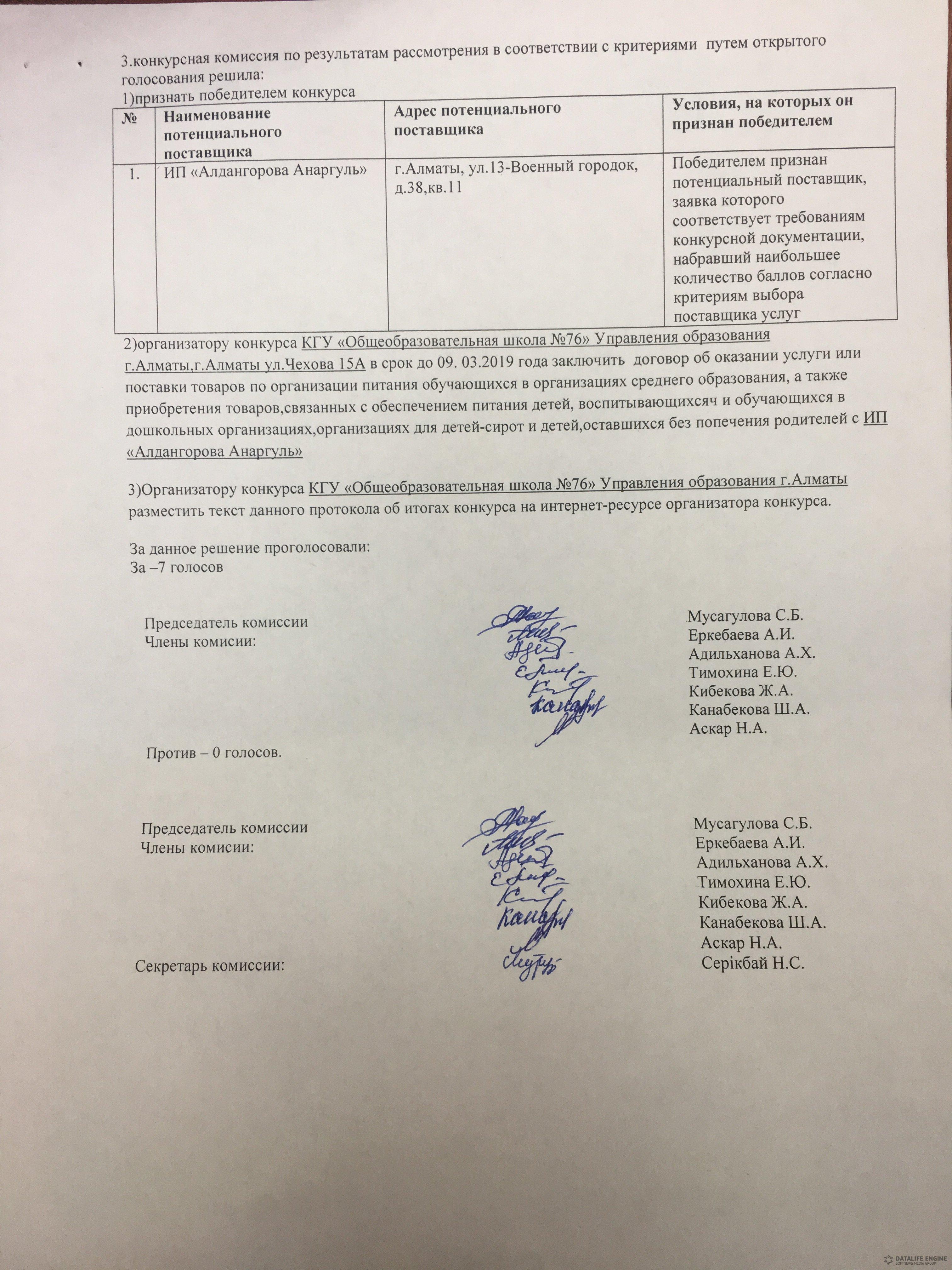 Протокол об итогах конкурса выбора поставщиков услуг организации обучающихся в КГУ ОШ № 76