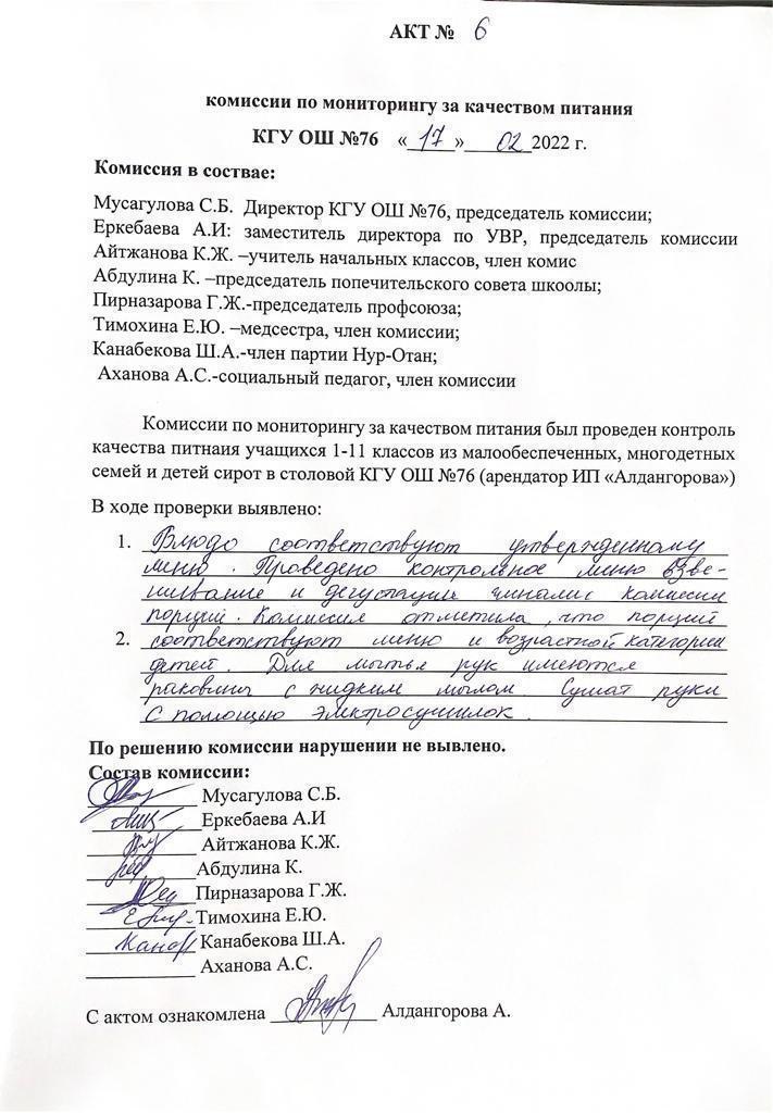 17 февраль 2022 0 1 2 3 4 5 Тамақтану сапасын бақылау комиссиясының № 6 актісі, АКТ №6 комиссии по мониторингу за качеством питания