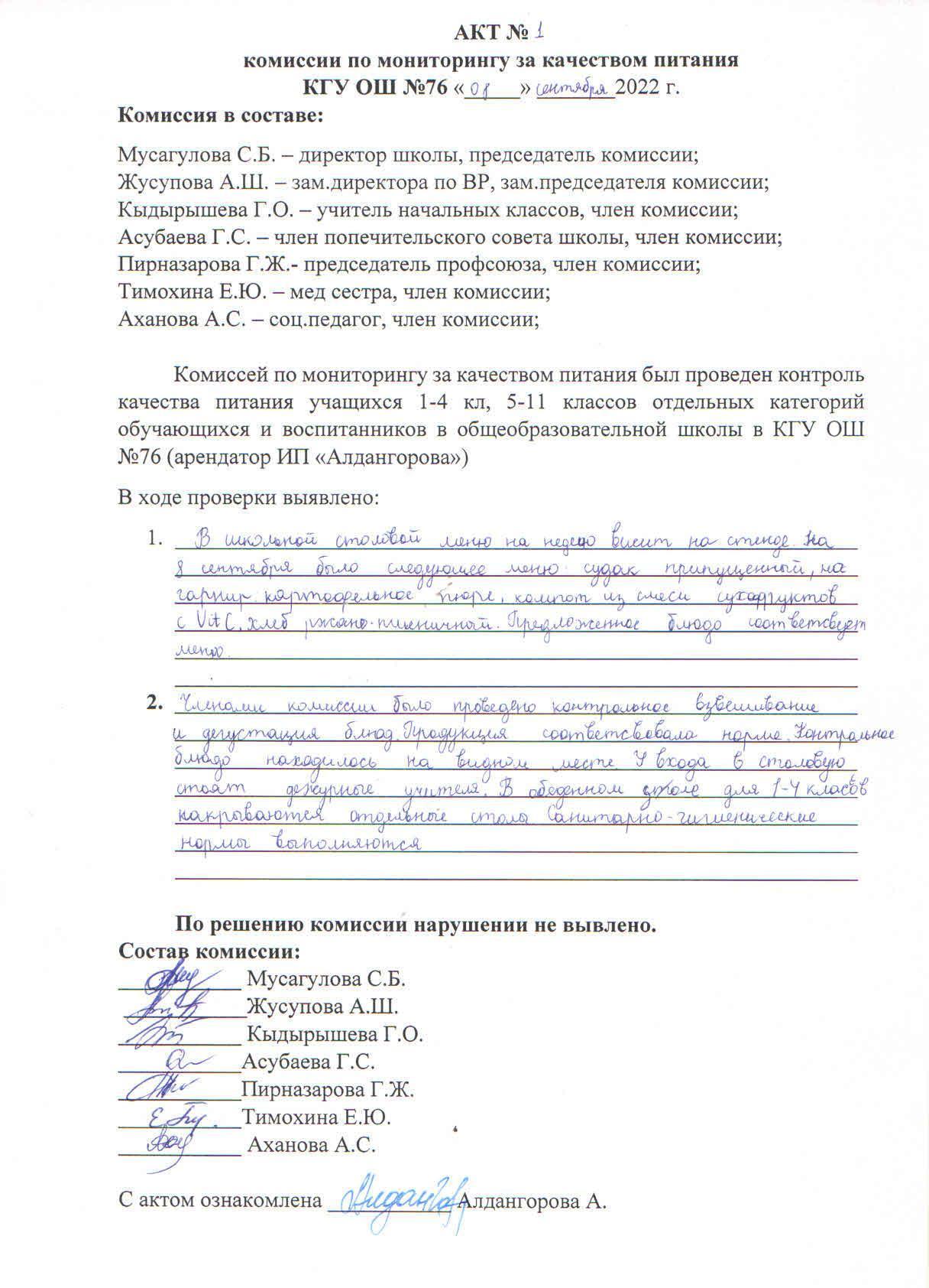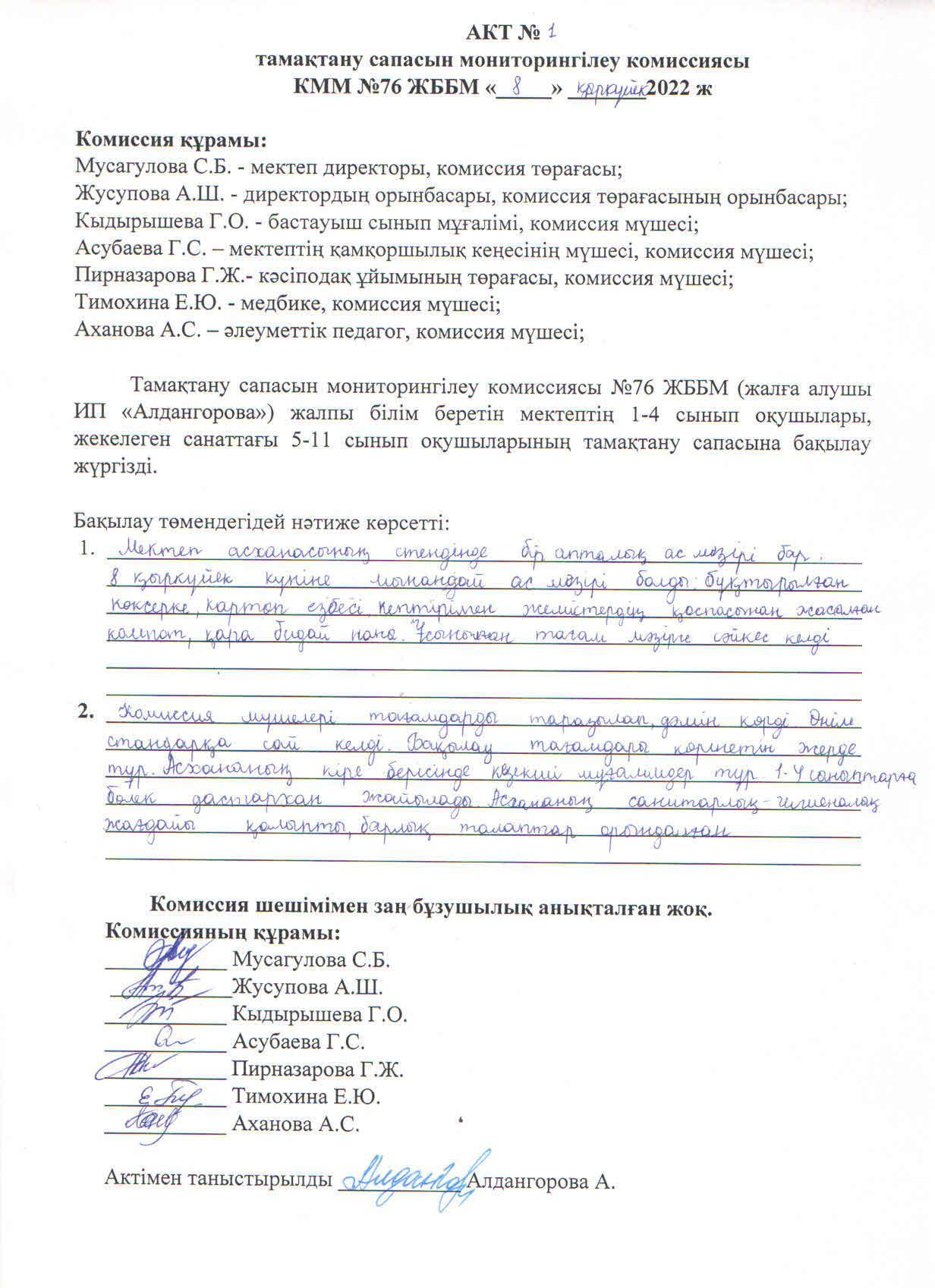 08 сентябрь 2022 0 1 2 3 4 5 Тамақтану сапасын бақылау комиссиясының №1 АКТ-ісі. АКТ №1 комиссии по мониторингу за качеством питания