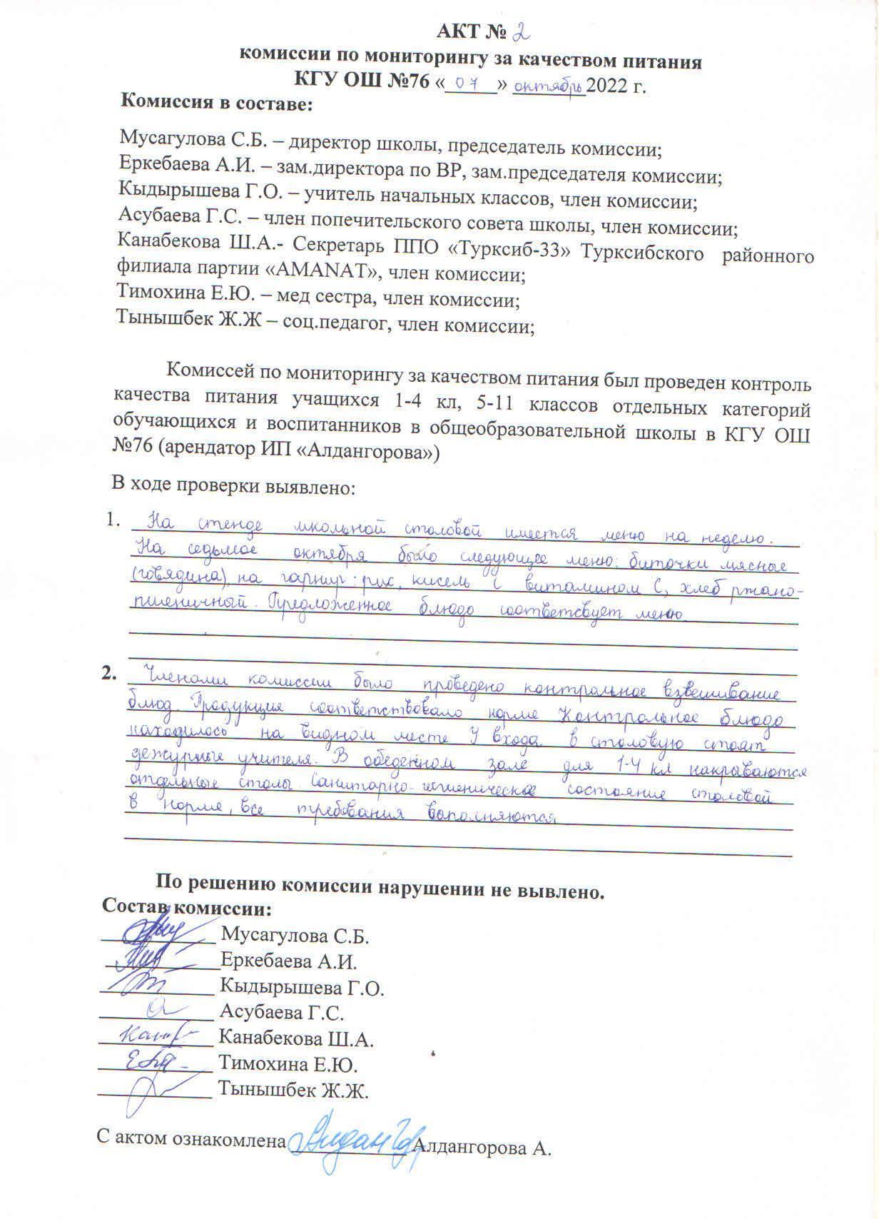 07 октябрь 2022 0 1 2 3 4 5 Тамақтану сапасын бақылау комиссиясының №2 АКТ-ісі. АКТ №2 комиссии по мониторингу за качеством питания