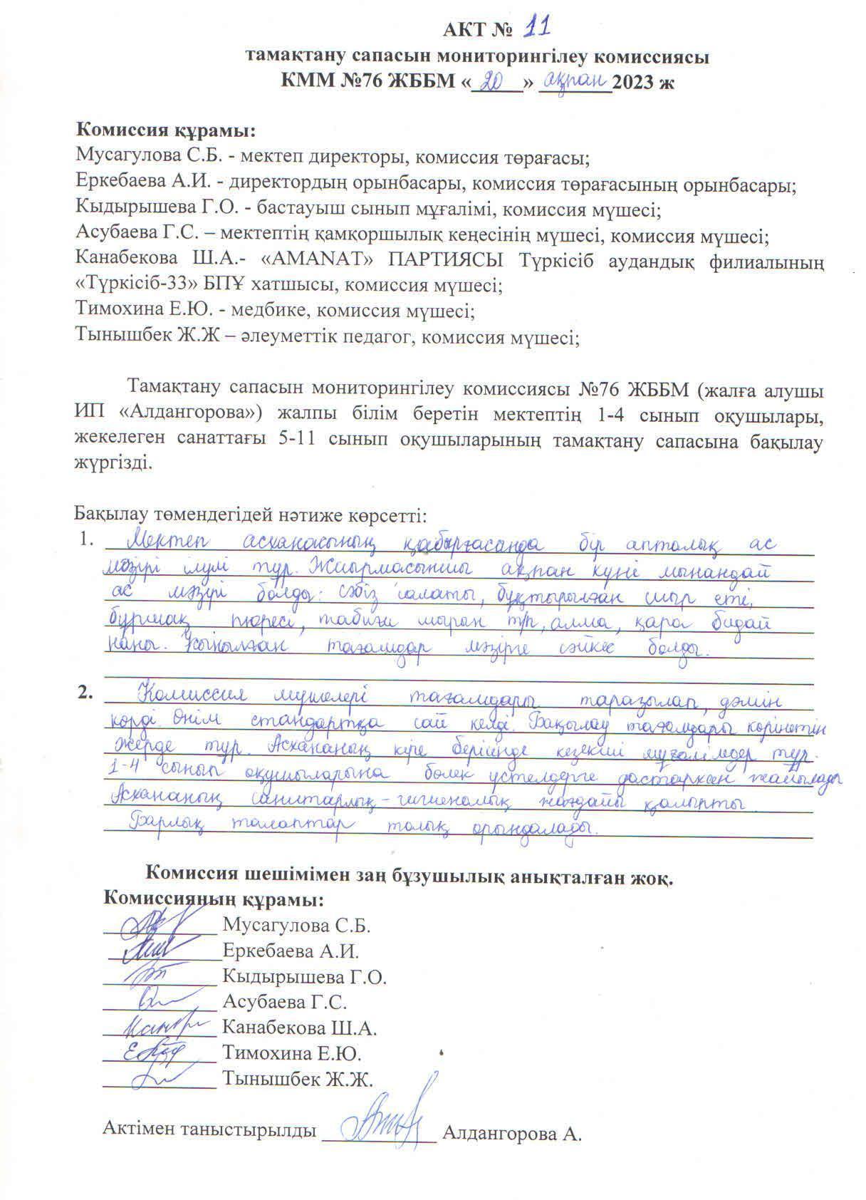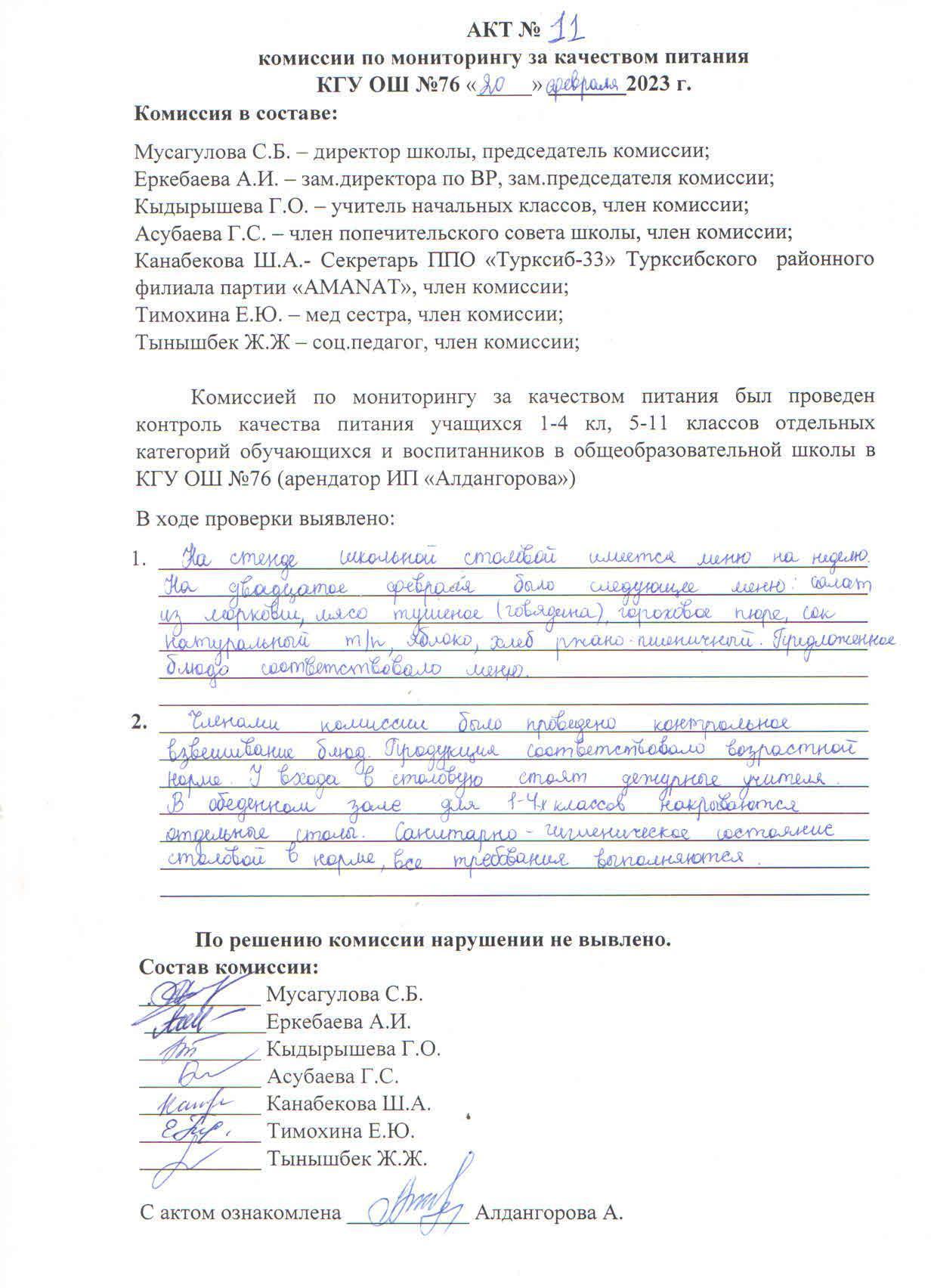 20 февраль 2023 0 1 2 3 4 5 Тамақтану сапасын бақылау комиссиясының №11 АКТ-ісі. АКТ №11 комиссии по мониторингу за качеством питания