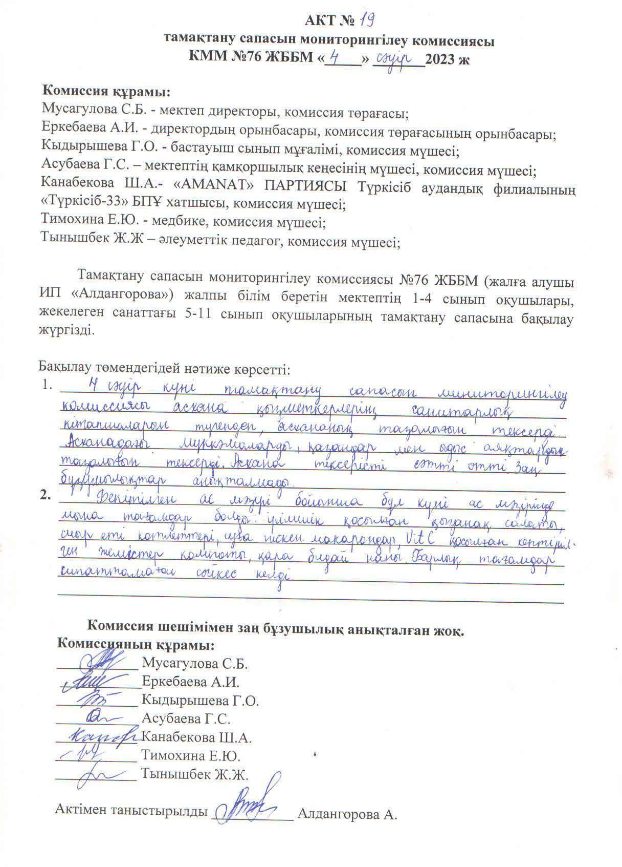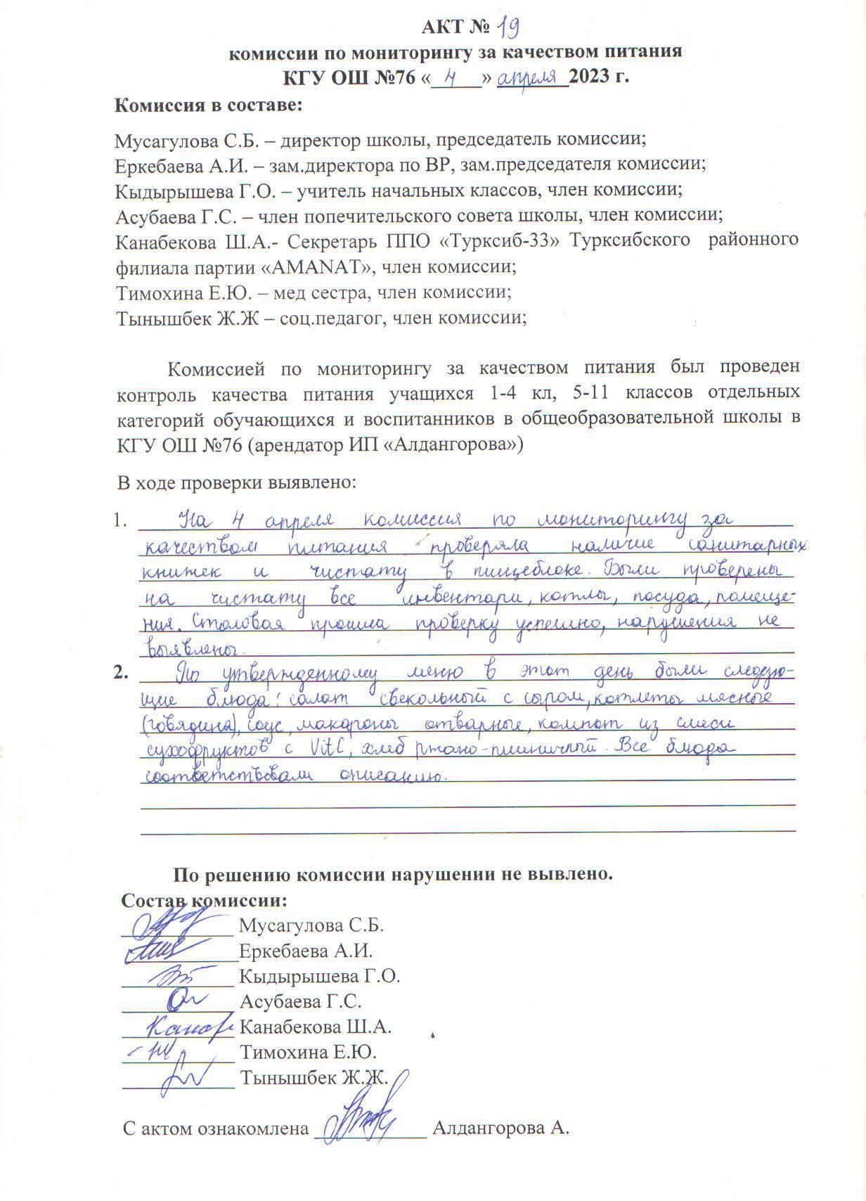 04 апрель 2023 0 1 2 3 4 5 Тамақтану сапасын бақылау комиссиясының №19 АКТ-ісі. АКТ №19 комиссии по мониторингу за качеством питания