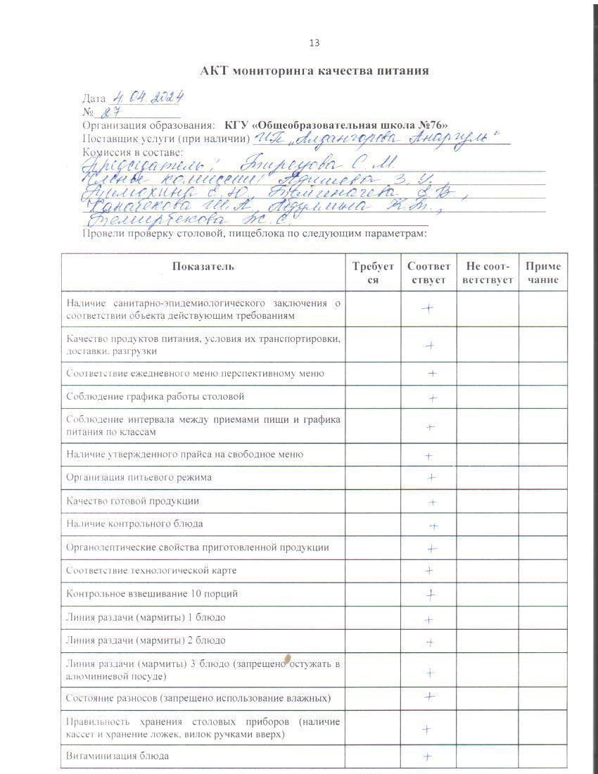 04 апрель 2024 0 1 2 3 4 5 Тамақ өнімдерінің сапасын бақылау жөніндегі комиссияның № 27 актісі. / Акт № 27 комиссии по мониторингу за качеством питания.