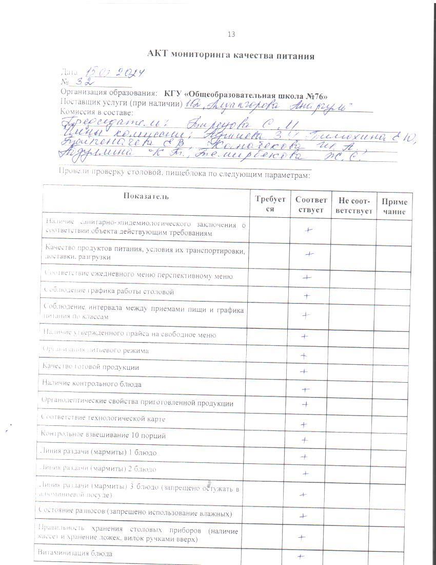 15 май 2024 0 1 2 3 4 5 Тамақ өнімдерінің сапасын бақылау жөніндегі комиссияның № 32 актісі. / Акт № 32 комиссии по мониторингу за качеством питания.