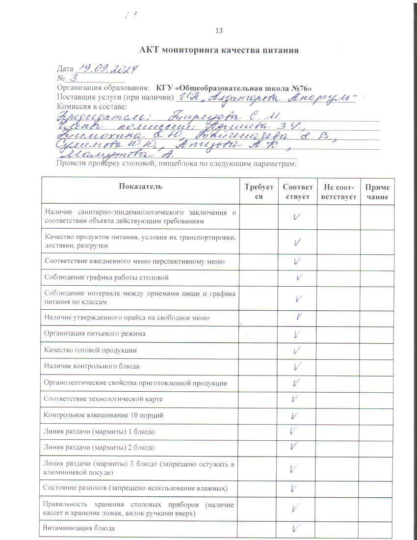 19 сентябрь 2024 0 1 2 3 4 5 Тамақ өнімдерінің сапасын бақылау жөніндегі комиссияның № 3 актісі. / Акт № 3 комиссии по мониторингу за качеством питания.