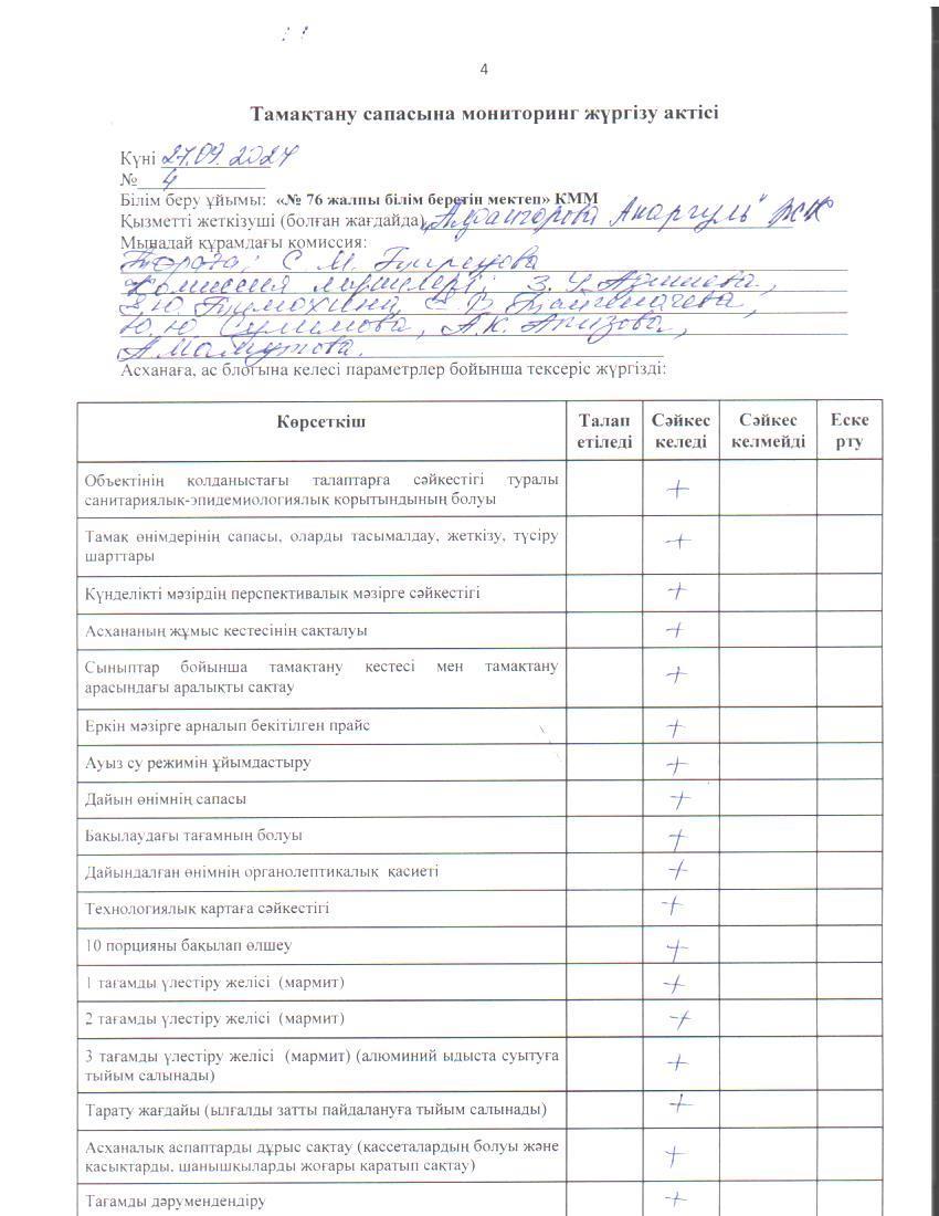 27 сентябрь 2024 0 1 2 3 4 5 Тамақ өнімдерінің сапасын бақылау жөніндегі комиссияның № 4 актісі. / Акт № 4 комиссии по мониторингу за качеством питания.