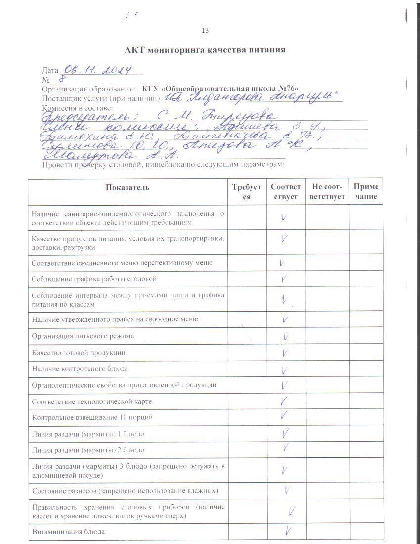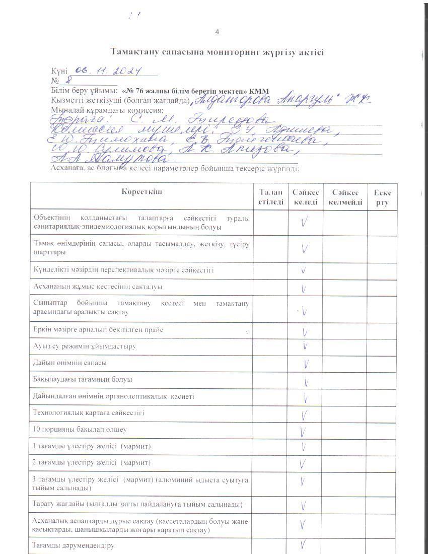 06 ноябрь 2024 0 1 2 3 4 5 Тамақ өнімдерінің сапасын бақылау жөніндегі комиссияның № 8 актісі. / Акт № 8 комиссии по мониторингу за качеством питания.
