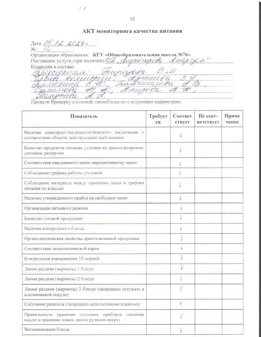 05 декабрь 2024 0 1 2 3 4 5 Тамақ өнімдерінің сапасын бақылау жөніндегі комиссияның № 12 актісі. / Акт № 12 комиссии по мониторингу за качеством питания.