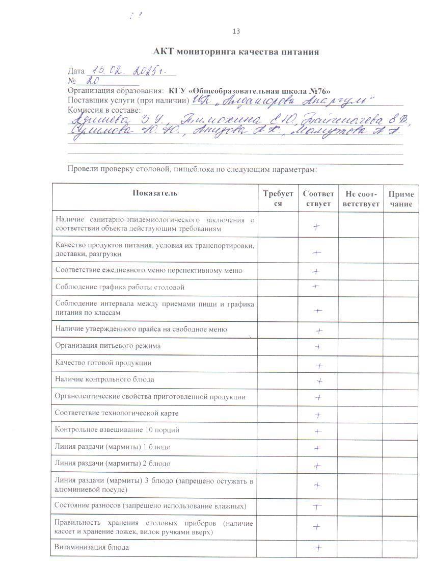 13 февраль 2025 0 1 2 3 4 5 Тамақ өнімдерінің сапасын бақылау жөніндегі комиссияның № 20 актісі. / Акт № 20 комиссии по мониторингу за качеством питания.