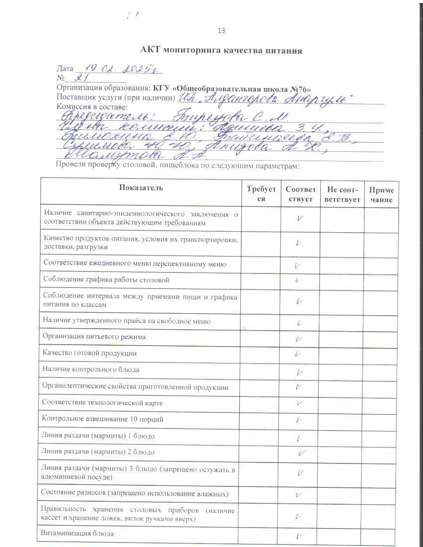 19 февраль 2025 0 1 2 3 4 5 Тамақ өнімдерінің сапасын бақылау жөніндегі комиссияның № 21 актісі. / Акт № 21 комиссии по мониторингу за качеством питания.