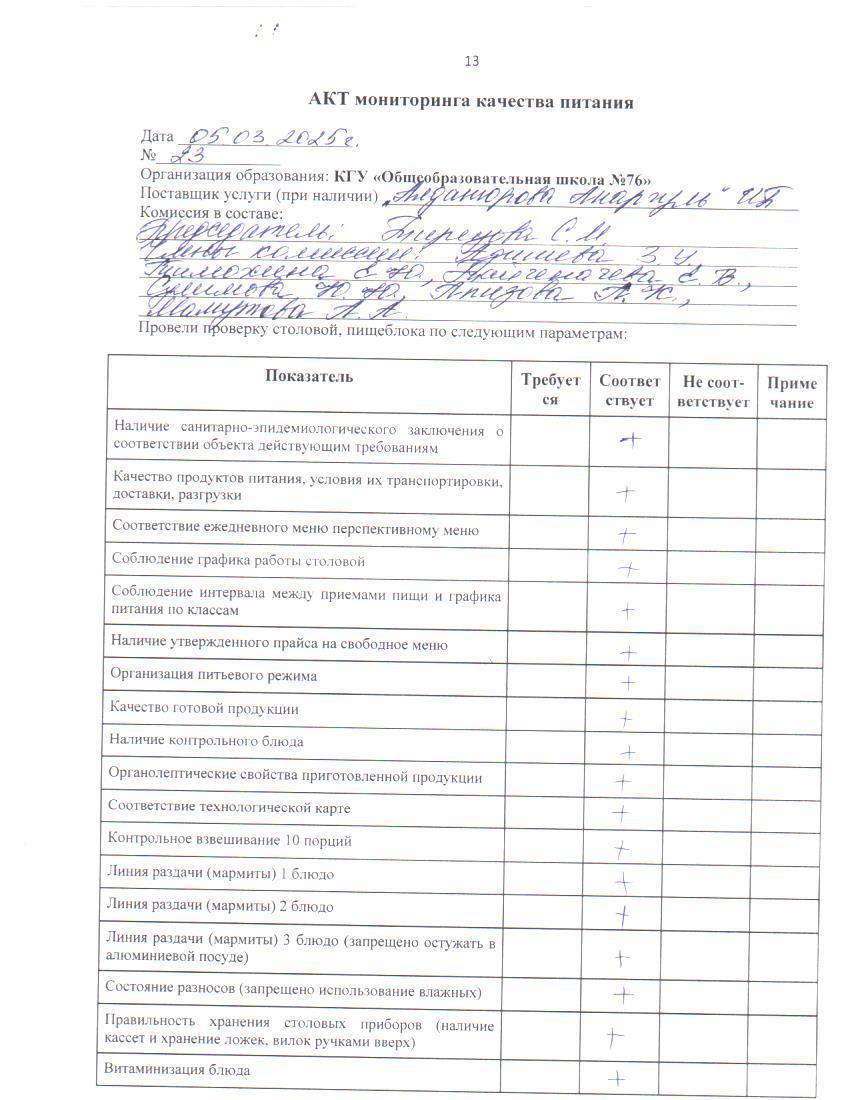 05 март 2025 0 1 2 3 4 5 Тамақ өнімдерінің сапасын бақылау жөніндегі комиссияның № 23 актісі. / Акт № 23 комиссии по мониторингу за качеством питания.
