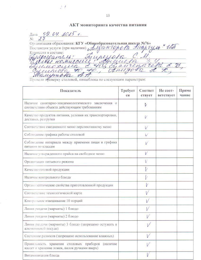 09 апрель 2025 0 1 2 3 4 5 Тамақ өнімдерінің сапасын бақылау жөніндегі комиссияның № 27 актісі. / Акт № 27 комиссии по мониторингу за качеством питания.
