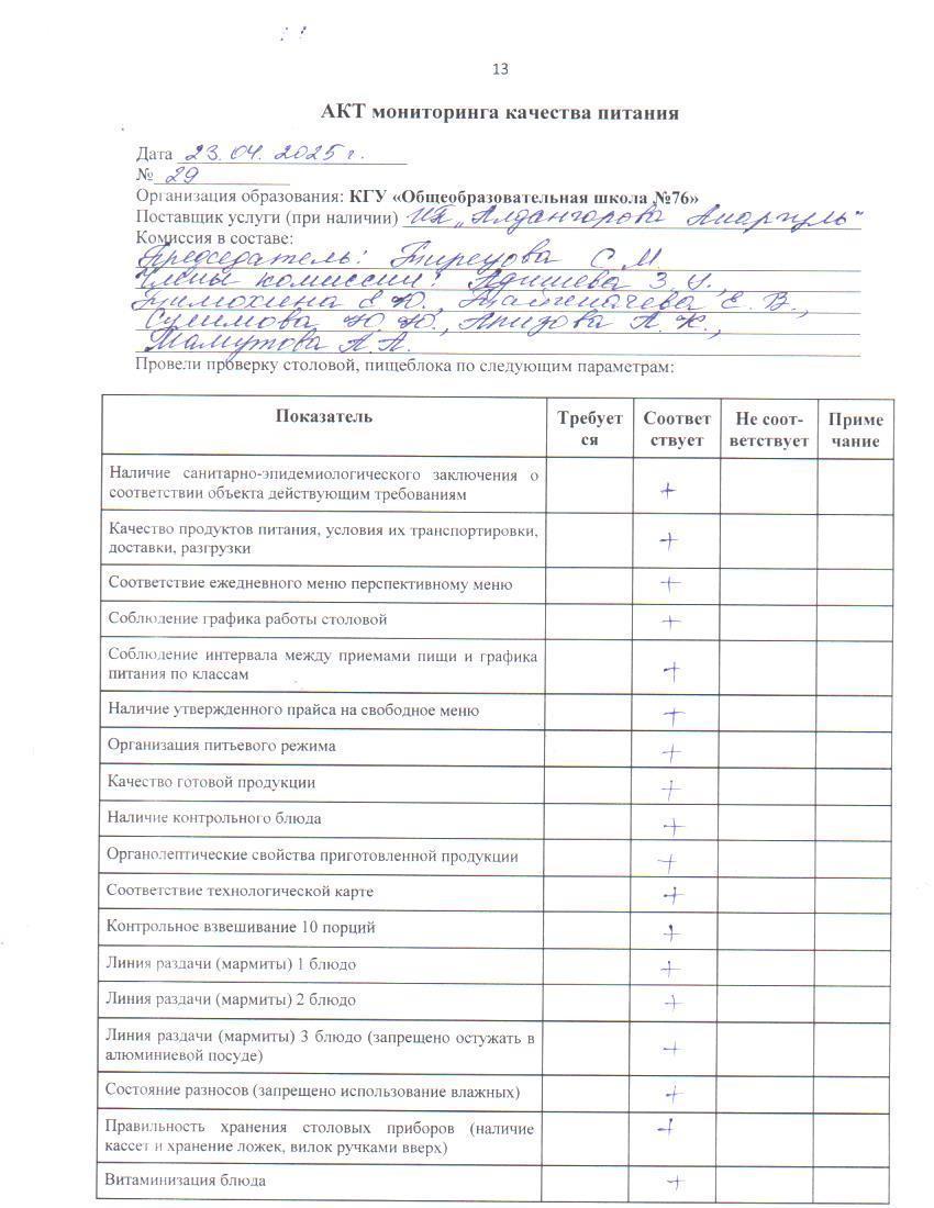 23 апрель 2025 0 1 2 3 4 5 Тамақ өнімдерінің сапасын бақылау жөніндегі комиссияның № 29 актісі. / Акт № 29 комиссии по мониторингу за качеством питания.