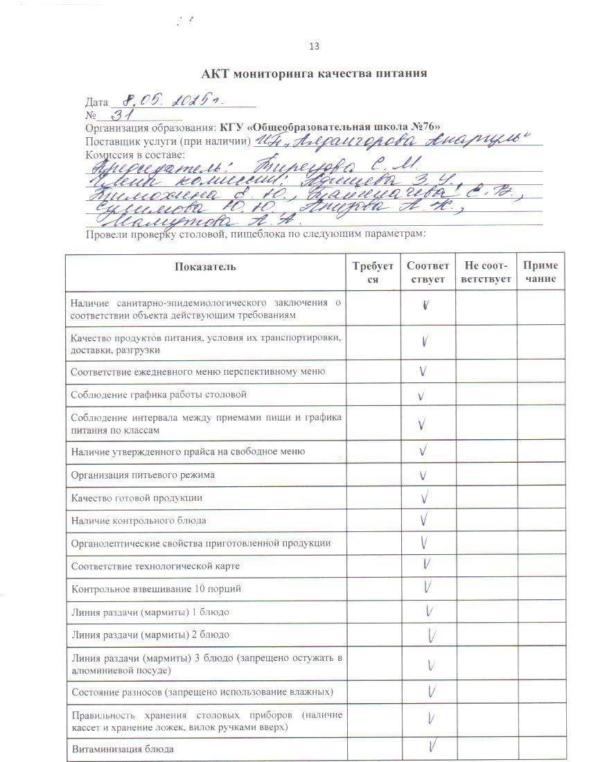 08 май 2025 0 1 2 3 4 5 Тамақ өнімдерінің сапасын бақылау жөніндегі комиссияның № 31 актісі. / Акт № 31 комиссии по мониторингу за качеством питания.