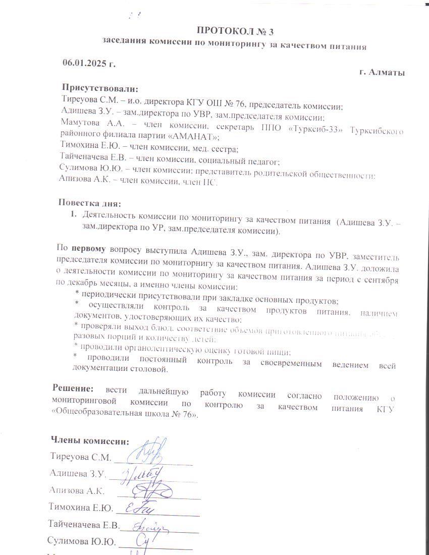 06 январь 2025 0 1 2 3 4 5 Тамақтану сапасын мониторингілеу жөніндегі комиссия отырысының № 3 хаттамасы / Протокол № 3 заседания комиссии по мониторингу за качеством питания