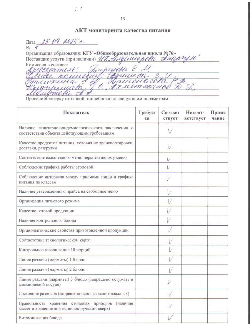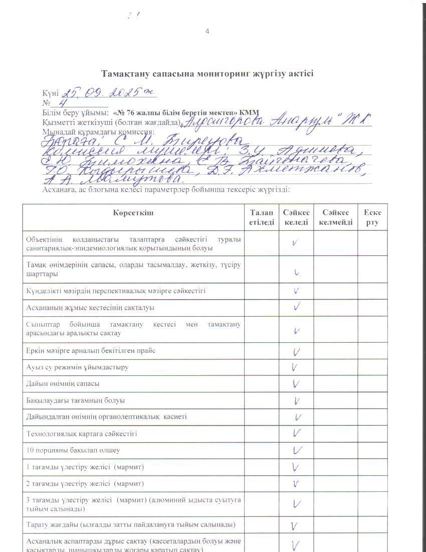 25 сентябрь 2025 0 1 2 3 4 5 Тамақ өнімдерінің сапасын бақылау жөніндегі комиссияның № 4 актісі. / Акт № 4 комиссии по мониторингу за качеством питания. Тамақ өнімдерінің сапасын бақылау жөніндегі комиссияның № 3 актісі. / Акт № 3 комиссии по мониторингу за качеством питания.