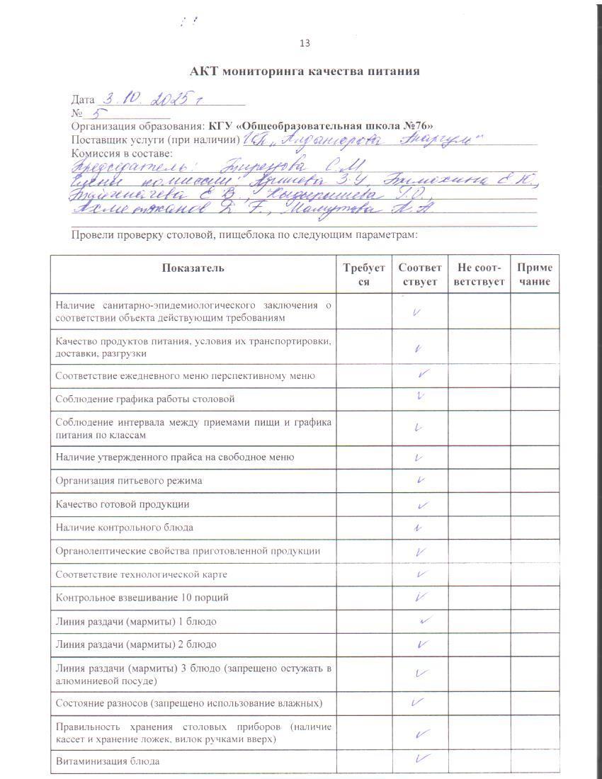 03 октябрь 2025 0 1 2 3 4 5 Тамақ өнімдерінің сапасын бақылау жөніндегі комиссияның № 5 актісі. / Акт № 5 комиссии по мониторингу за качеством питания. Тамақ өнімдерінің сапасын бақылау жөніндегі комиссияның № 3 актісі. / Акт № 3 комиссии по мониторингу за качеством питания.