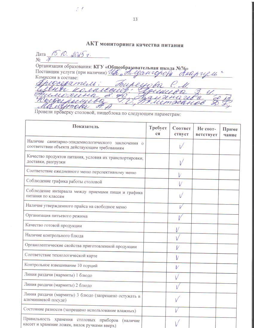 15 октябрь 2025 0 1 2 3 4 5 Тамақ өнімдерінің сапасын бақылау жөніндегі комиссияның № 7 актісі. / Акт № 7 комиссии по мониторингу за качеством питания. Тамақ өнімдерінің сапасын бақылау жөніндегі комиссияның № 7 актісі. / Акт № 7 комиссии по мониторингу за качеством питания.