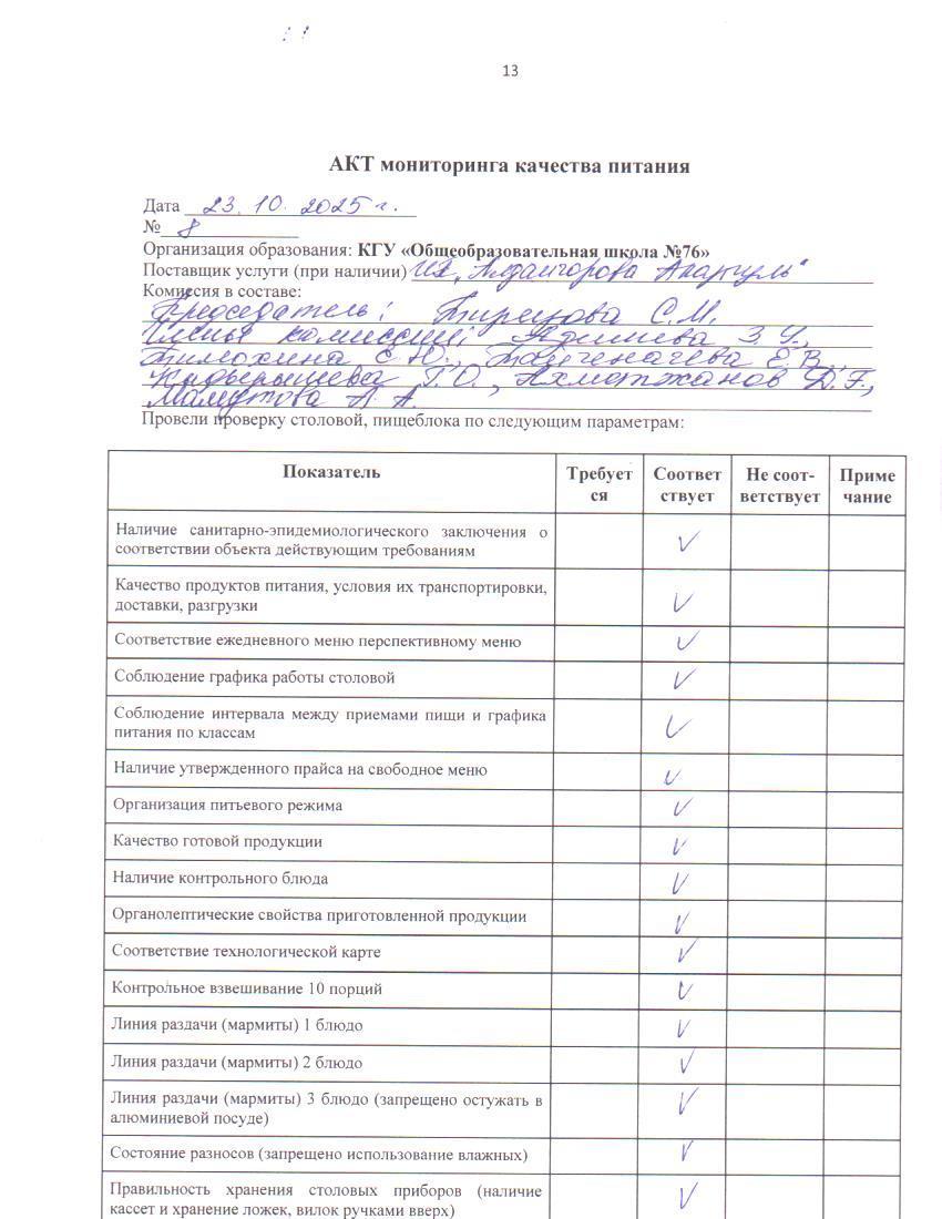 23 октябрь 2025 0 1 2 3 4 5 Тамақ өнімдерінің сапасын бақылау жөніндегі комиссияның № 8 актісі. / Акт № 8 комиссии по мониторингу за качеством питания. Тамақ өнімдерінің сапасын бақылау жөніндегі комиссияның № 8 актісі. / Акт № 8 комиссии по мониторингу за качеством питания.