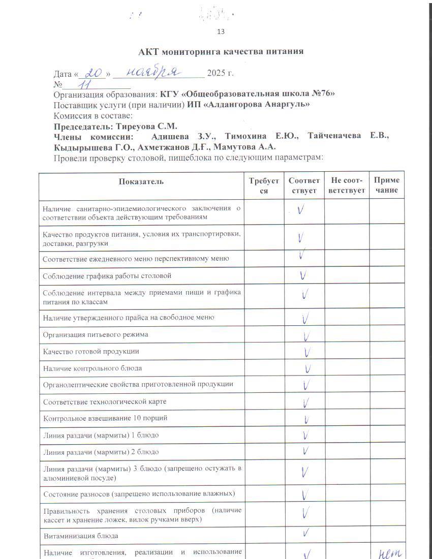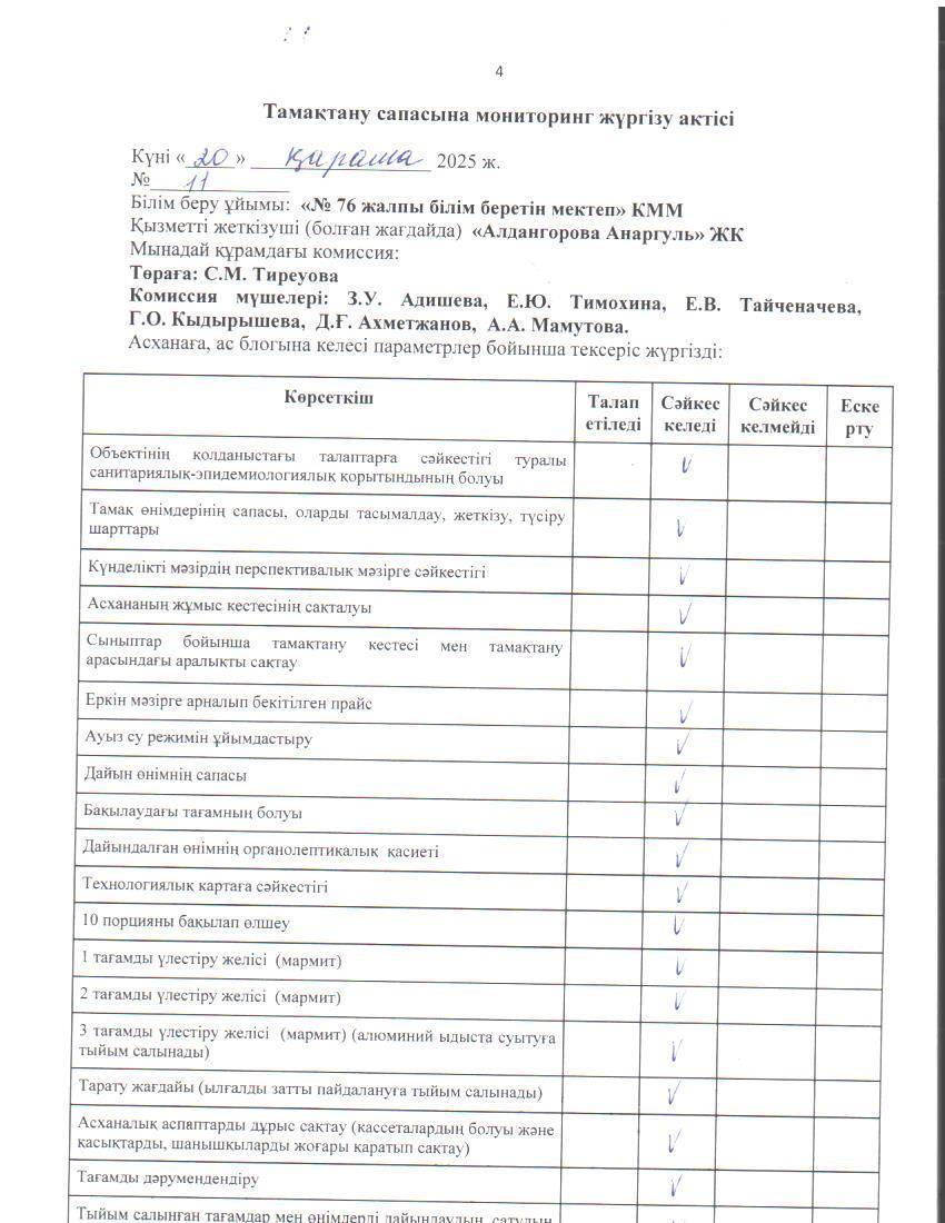 20 ноябрь 2025 0 1 2 3 4 5 Тамақ өнімдерінің сапасын бақылау жөніндегі комиссияның № 11 актісі. / Акт № 11 комиссии по мониторингу за качеством питания. Тамақ өнімдерінің сапасын бақылау жөніндегі комиссияның № 11 актісі. / Акт № 11 комиссии по мониторингу за качеством питания.