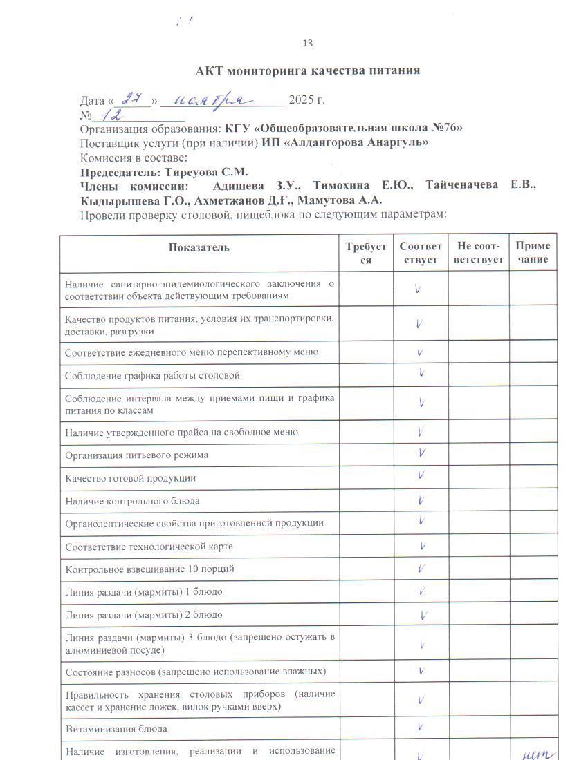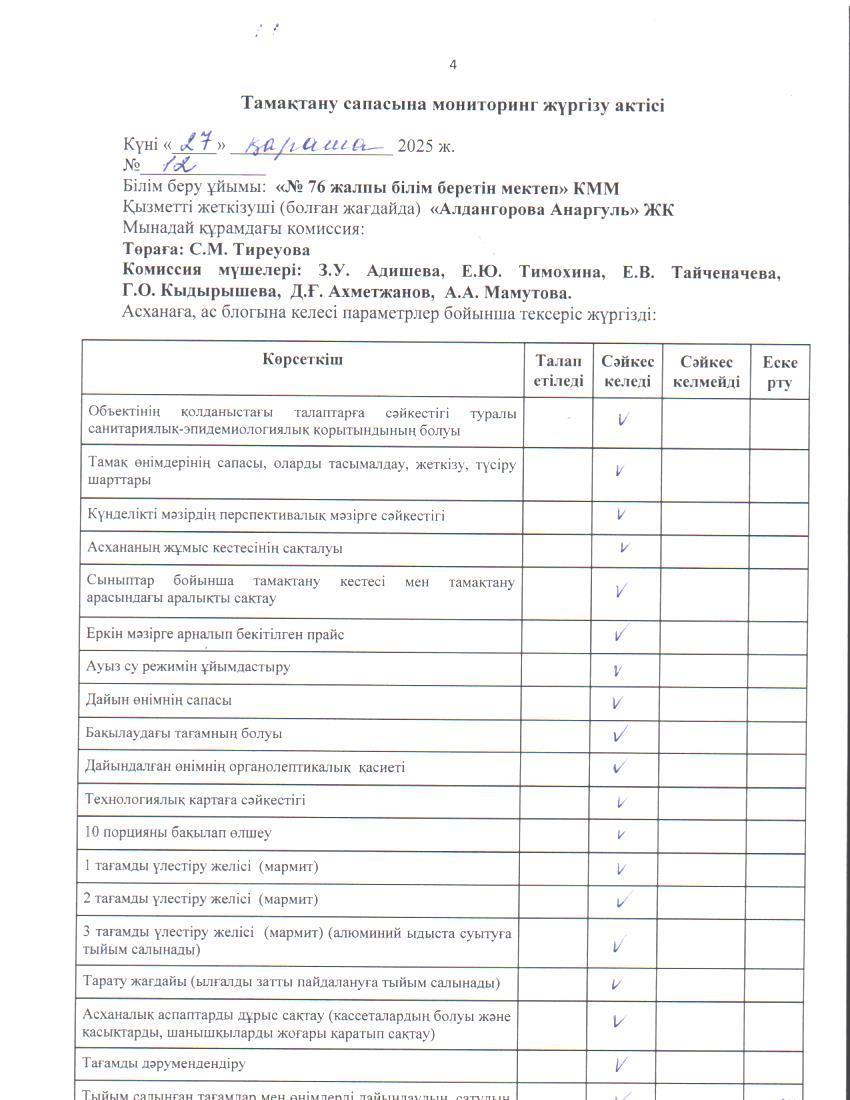 27 ноябрь 2025 0 1 2 3 4 5 Тамақ өнімдерінің сапасын бақылау жөніндегі комиссияның № 12 актісі. / Акт № 12 комиссии по мониторингу за качеством питания. Тамақ өнімдерінің сапасын бақылау жөніндегі комиссияның № 12 актісі. / Акт № 12 комиссии по мониторингу за качеством питания.