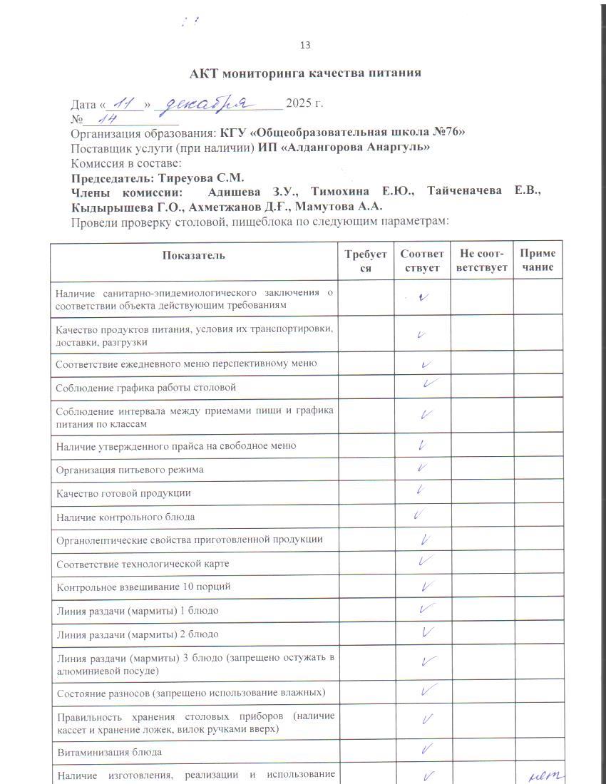 11 декабрь 2025 0 1 2 3 4 5 Тамақ өнімдерінің сапасын бақылау жөніндегі комиссияның № 14 актісі. / Акт № 14 комиссии по мониторингу за качеством питания.
