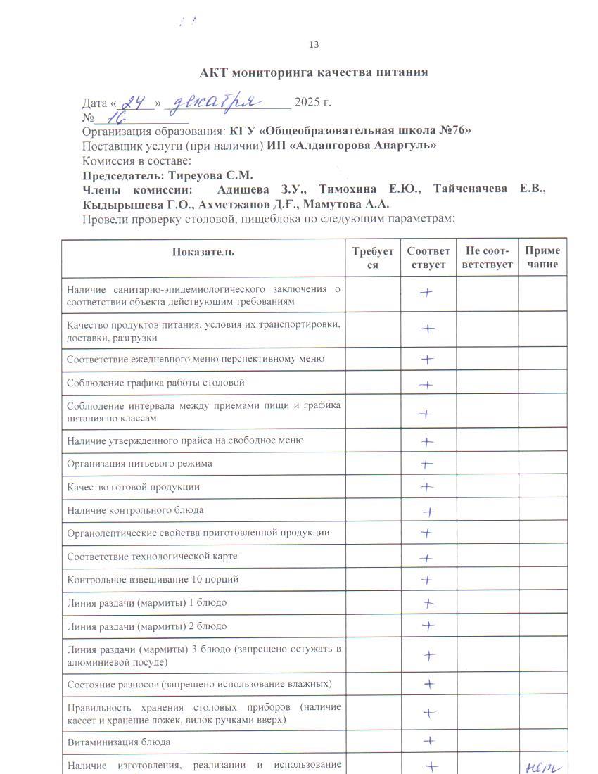 24 декабрь 2025 0 1 2 3 4 5 Тамақ өнімдерінің сапасын бақылау жөніндегі комиссияның № 16 актісі. / Акт № 16 комиссии по мониторингу за качеством питания.