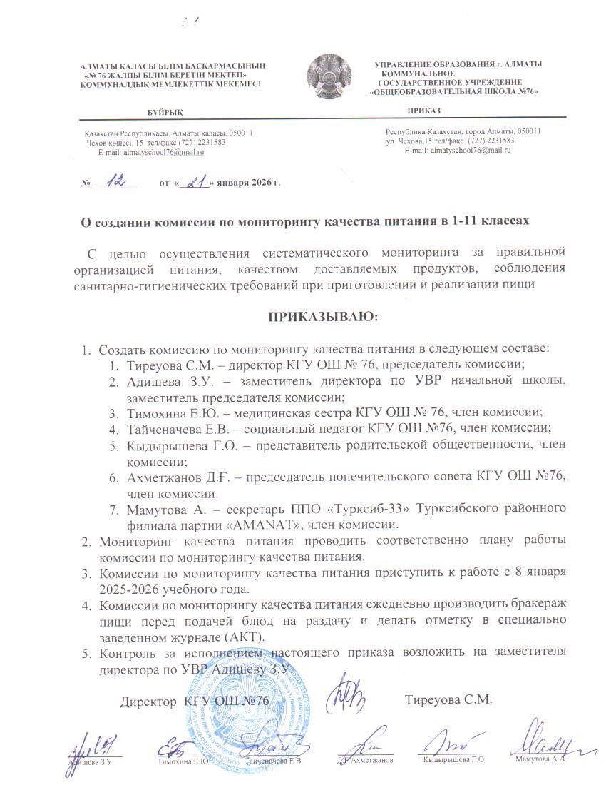 21 январь 2026 0 1 2 3 4 5 1-11 сыныптардың тамақтану сапасын бақылау комиссиясын құру туралы / О создании комиссии по мониторингу качества питания в 1-11 классах