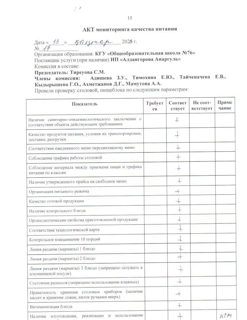 13 январь 2026 0 1 2 3 4 5 Тамақ өнімдерінің сапасын бақылау жөніндегі комиссияның № 17 актісі. / Акт № 17 комиссии по мониторингу за качеством питания.