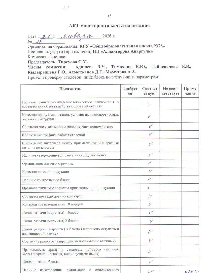 21 январь 2026 0 1 2 3 4 5 Тамақ өнімдерінің сапасын бақылау жөніндегі комиссияның № 18 актісі. / Акт № 18 комиссии по мониторингу за качеством питания.
