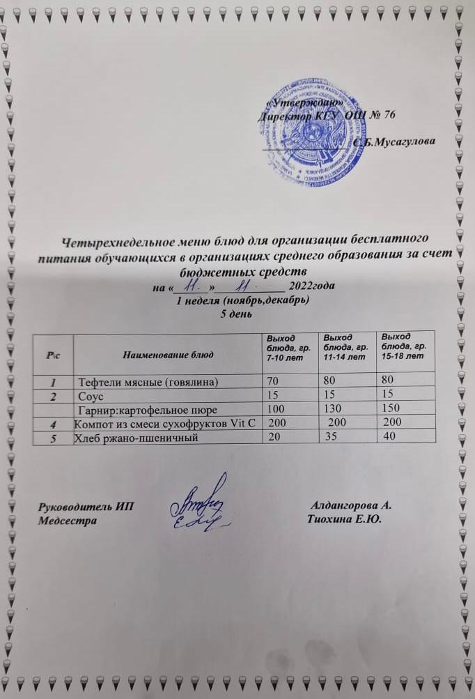 Четырехнедельное меню блюд для организации бесплатного питания обучающихся в организациях среднего образования за счет бюджетных средств (сентябрь, октябрь, ноябрь, декабрь)