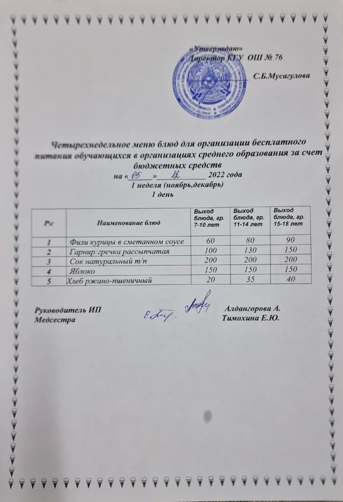 Четырехнедельное меню блюд для организации бесплатного питания обучающихся в организациях среднего образования за счет бюджетных средств (ноябрь, декабрь)