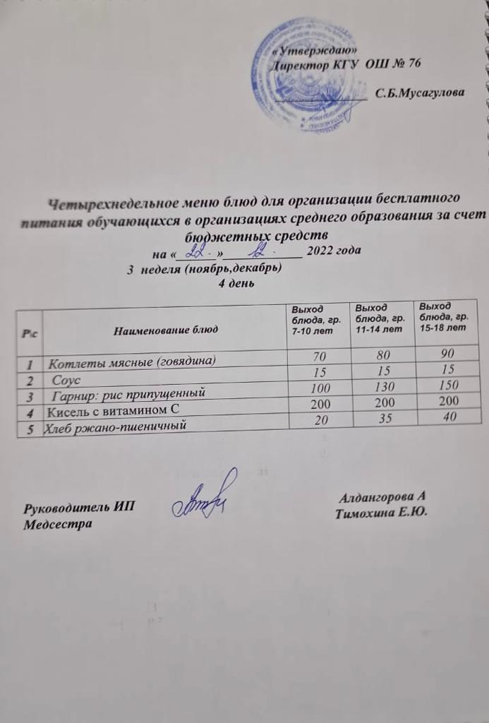 Четырехнедельное меню блюд для организации бесплатного питания обучающихся в организациях среднего образования за счет бюджетных средств (ноябрь, декабрь)