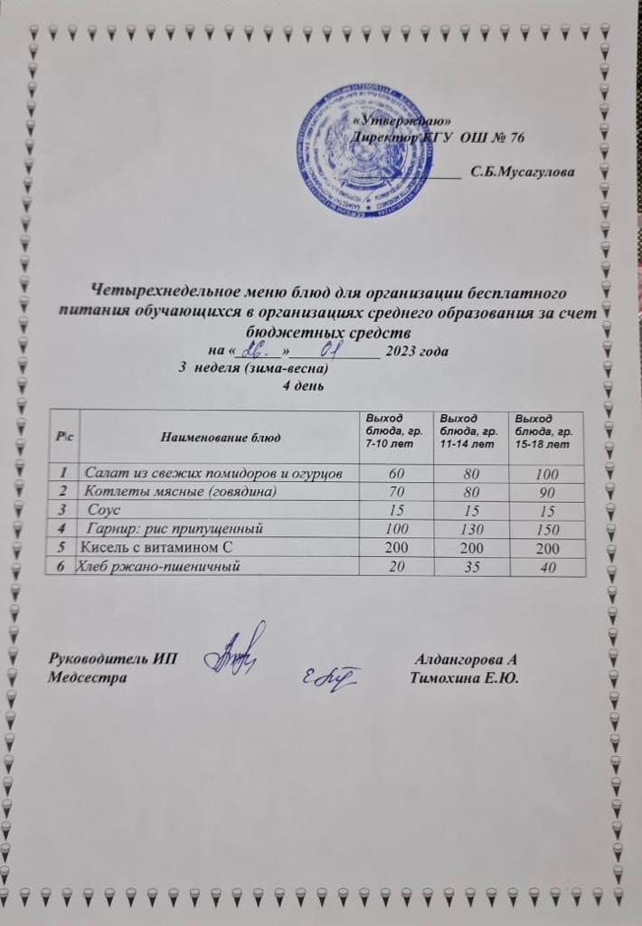 Четырехнедельное меню блюд для организации бесплатного питания обучающихся в организациях среднего образования за счет бюджетных средств (зима-весна)