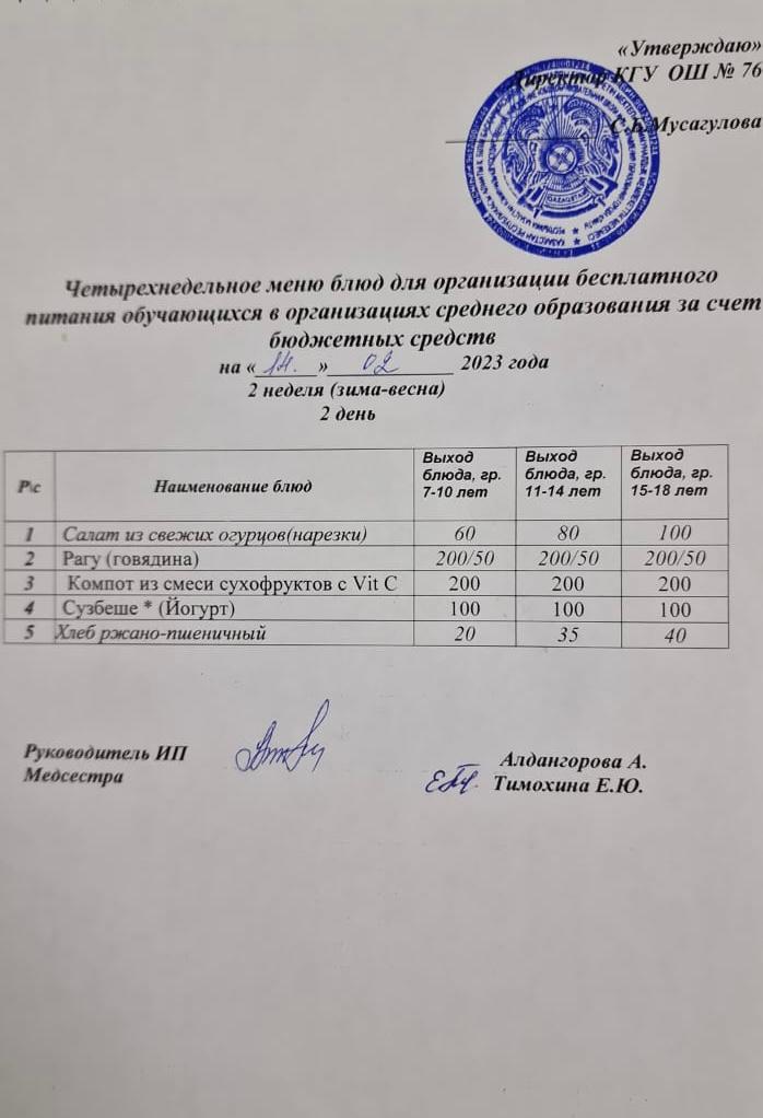 Бюджет қаражаты есебінен орта білім беру ұйымдарында оқушыларды тегін тамақтандыруды ұйымдастыруға арналған төрт апталық тағамдар мәзірі. (қыс-көктем )