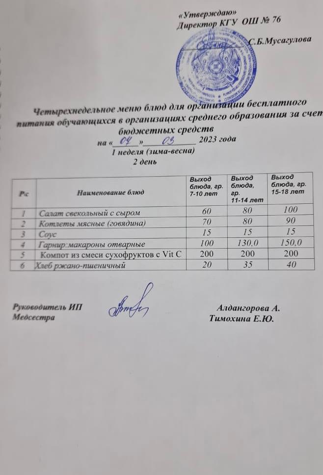 Бюджет қаражаты есебінен орта білім беру ұйымдарында оқушыларды тегін тамақтандыруды ұйымдастыруға арналған төрт апталық тағамдар мәзірі. (қыс-көктем )