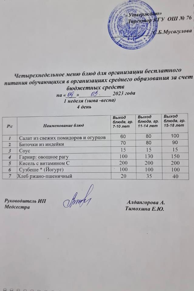 Бюджет қаражаты есебінен орта білім беру ұйымдарында оқушыларды тегін тамақтандыруды ұйымдастыруға арналған төрт апталық тағамдар мәзірі. (қыс-көктем )