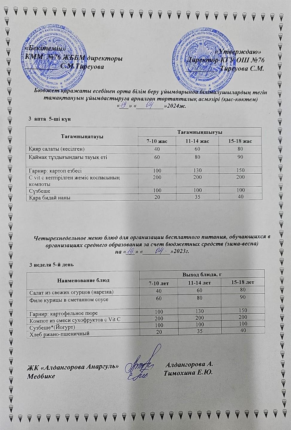 19 апрель 2024 0 1 2 3 4 5 1-4 сынып, 5-11 сынып ХӘОТ мәзірі. Қыс-Көктем 2024 жыл. / Меню 1-4 кл, 5-11 кл СУСН. Зима- весна 2024