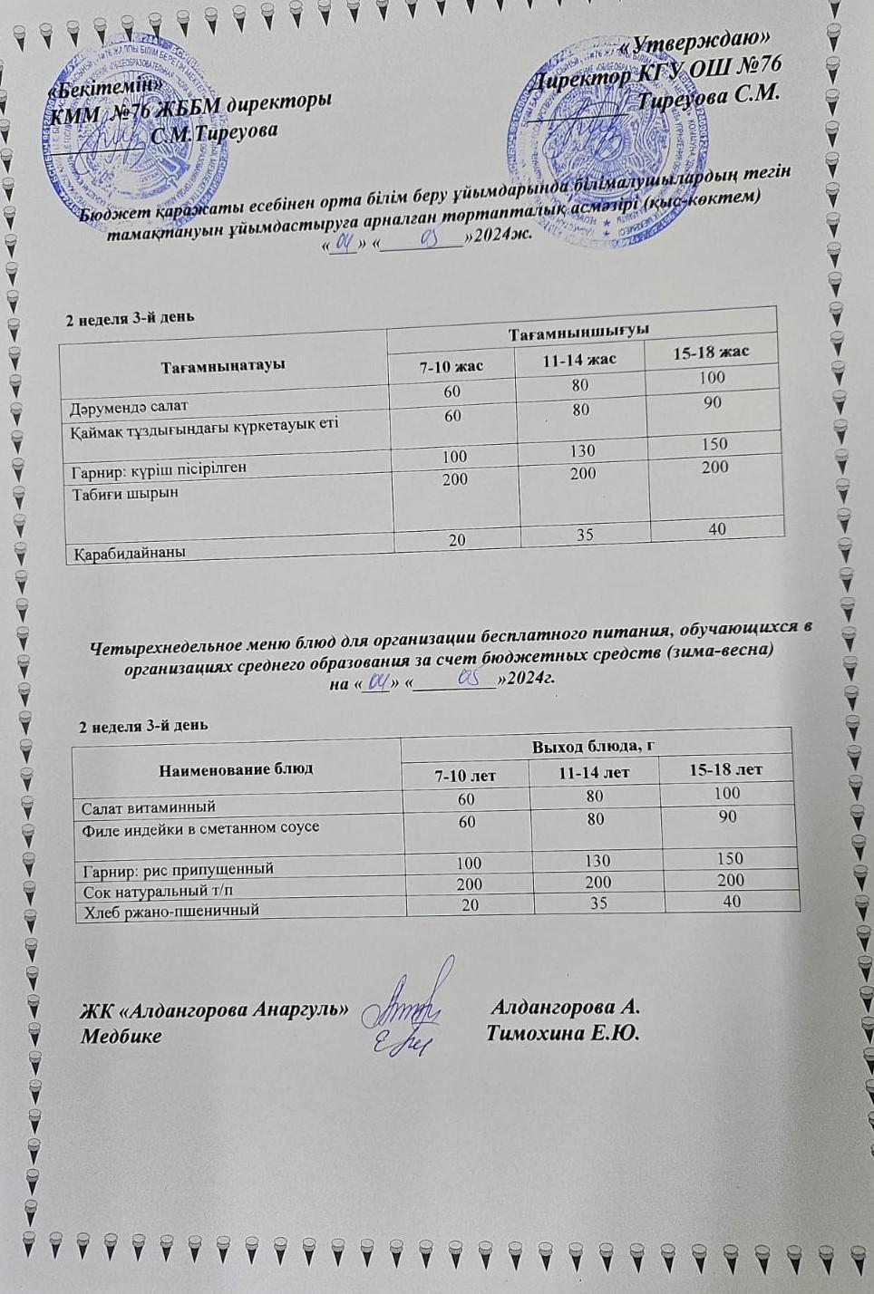 04 май 2024 0 1 2 3 4 5 1-4 сынып, 5-11 сынып ХӘОТ мәзірі. Қыс-Көктем 2024 жыл. / Меню 1-4 кл, 5-11 кл СУСН. Зима- весна 2024