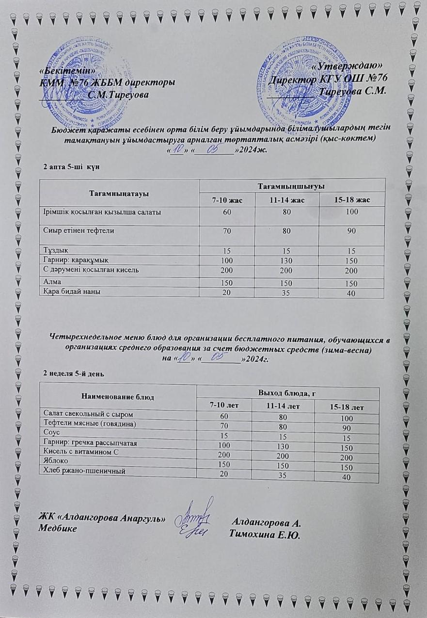 10 май 2024 0 1 2 3 4 5 1-4 сынып, 5-11 сынып ХӘОТ мәзірі. Қыс-Көктем 2024 жыл. / Меню 1-4 кл, 5-11 кл СУСН. Зима- весна 2024